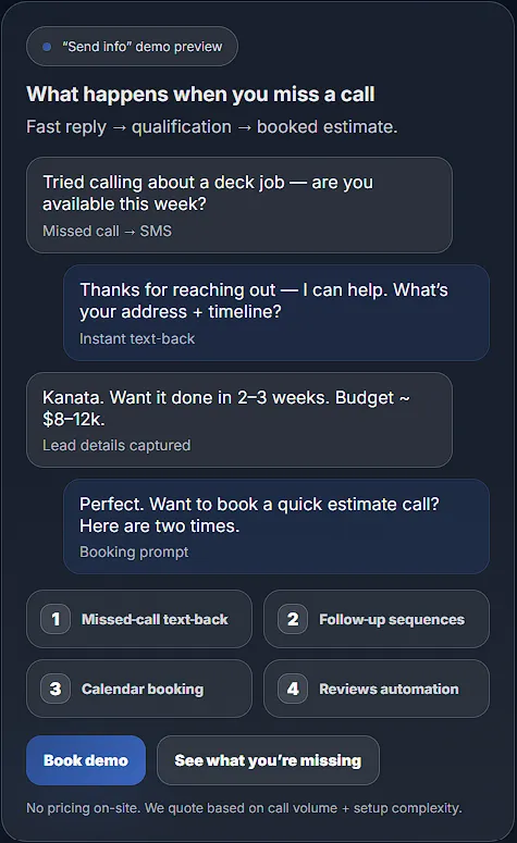 This should show: missed call → instant text-back → lead captured → booked estimate → review request.